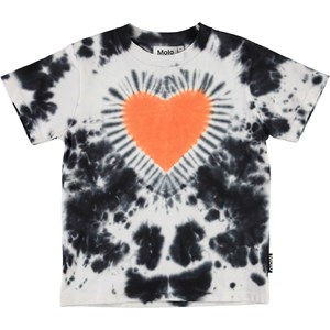 Roxo, in the "Heart Tie Dye" print, is a t-shirt in black and white tie dye with a red heart on the chest.