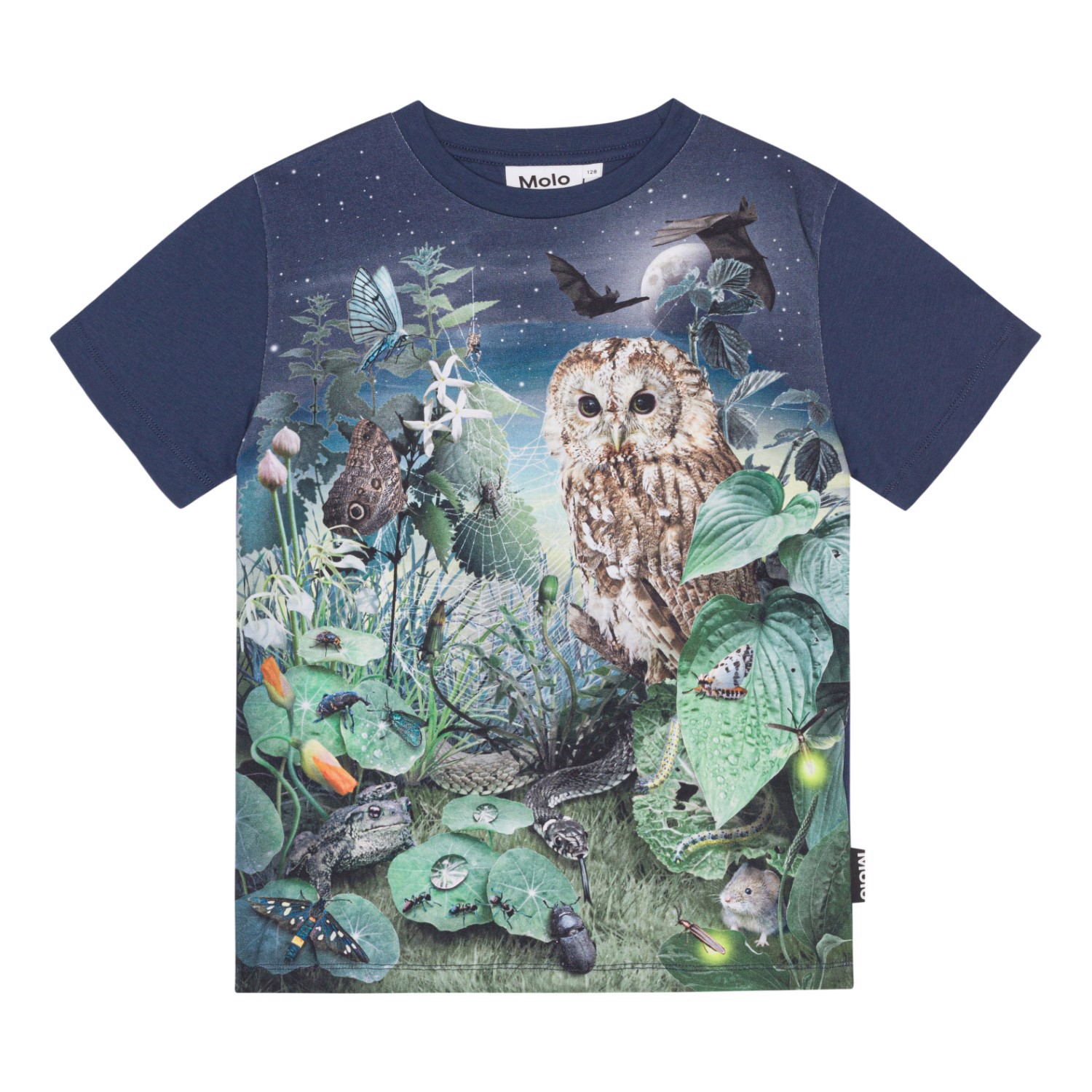 Grey blue t-shirt in 100% organic cotton with a placement print on the front. The print invites you to explore the garden at night time. Some of the flowers have closed for the night, and other flowers are blooming in the dark, to the delight of the nocturnal insects. How many animals can you spot? Did you know that the wilder, more natural your garden is, the more it helps biodiversity? The wilder the garden, the more inviting it is for different animals and plants. Roxo has a round neck with an edge tape and is in a regular fit.
