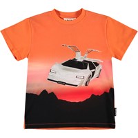 Roxo is an orange T-shirt with a flying car on the chest. In the background, you can see the dark mountains rising up against the orange sunset, and the car is using its doors as wings.