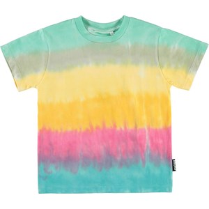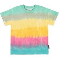 Roxo with the "Rainbow Tie Dye" print is a t-shirt that leads your thoughts to sun, summer fun, playing at the water's edge and ice cream at sunset.