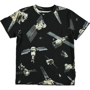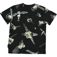 Roxo is a black t-shirt with an all-over print of satillites flying around in space.