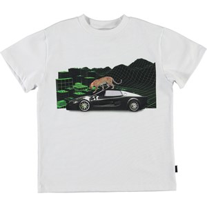 Roxo is a white t-shirt with a print of a leopard climbing on a car.