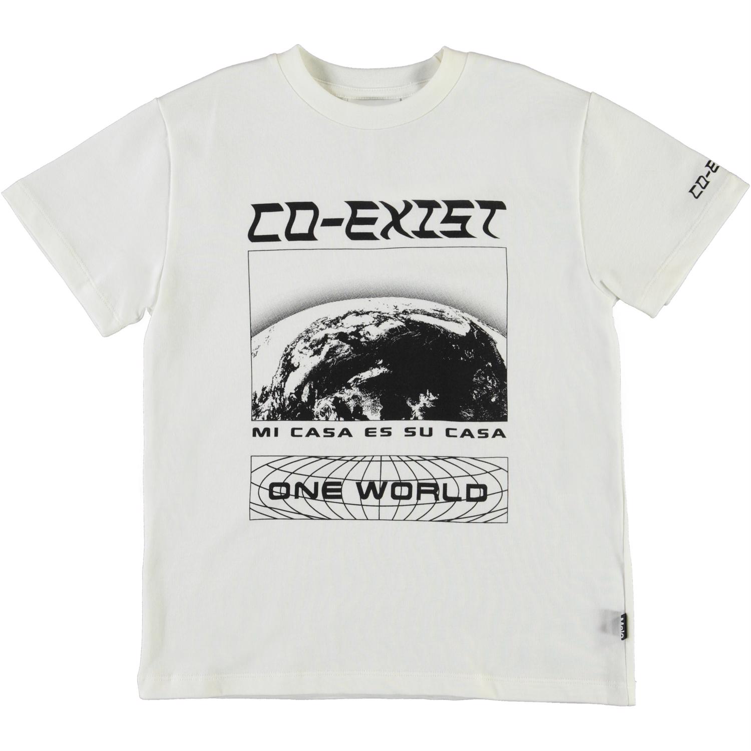 Roxo is a white t-shirt with a print of planet Earth with the text 'One world' and 'Co-exist'.