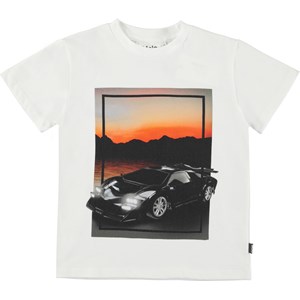 Roxo is a white t-shirt with a picture of a race car in a sunset on the chest.