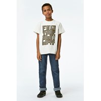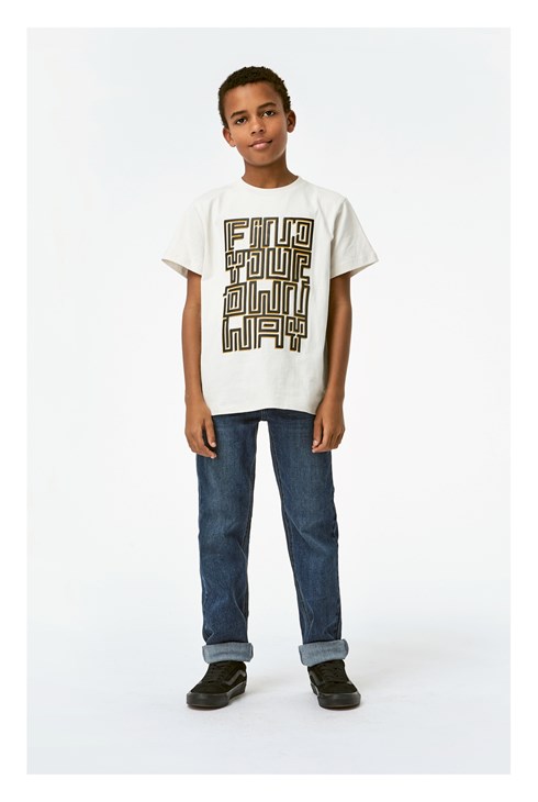 "Find your own way" in the print on the front of the white Roxo t-shirt.