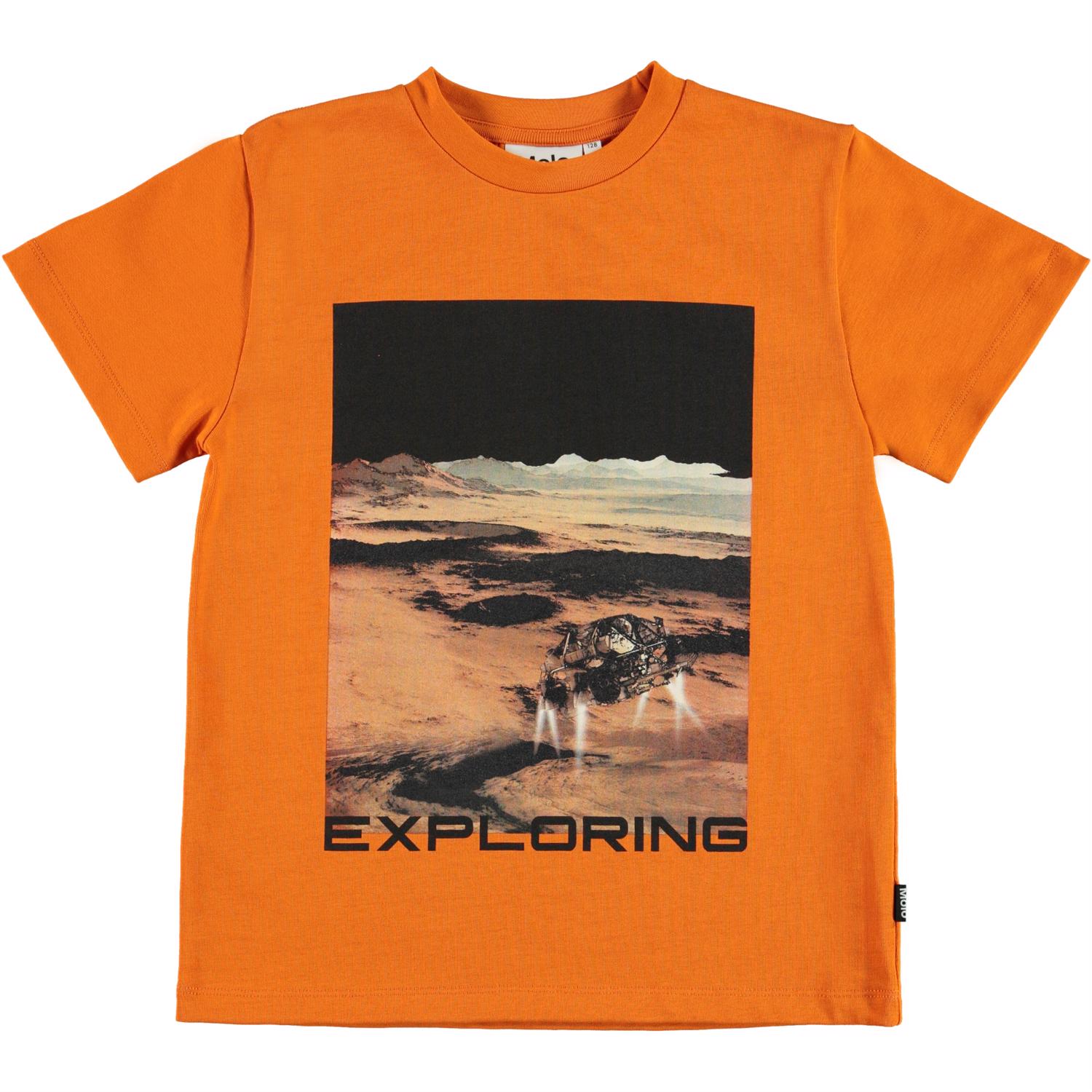 Roxo is an orange t-shirt with a print of Mars and the text 'Exploring' on the front.