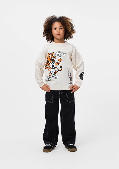 Blue and white, long-sleeved top made of soft organic cotton with ribbed edges around the neck and sleeves. The top has a loose fit and a sporty basketball-inspired look with the number 11 on the back and the text 'Unity'.