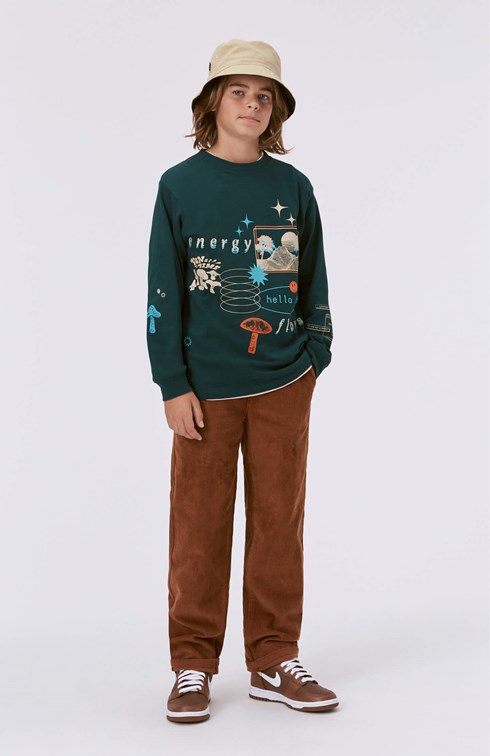 Dark green, long sleeve t-shirt with a placement print. The print is a graphic collage, inspired by the blurred lines between the real world and the world you find on line. ”Energy Flows” explores the similarities rather than the contrast between these two worlds. You can find elements inspired by computer graphics like pop-up windows, 3D sketches but also pictures of real trees. This long sleeve t-shirt is in 100% cotton, has a round neck with a rib edge, long sleeves and rib at the sleeves. It is in a loose fit. Wear it under a short sleeve t-shirt for a cool, layer-on-layer look.