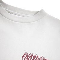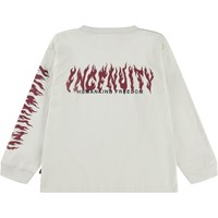 Off-white long-sleeved top made of organic cotton with ribbed neckline and sleeves. The long-sleeved top has a loose fit with a print of the red flaming text ''Ingenuity, humankind freedom'' on the sleeve, the front and the back.
