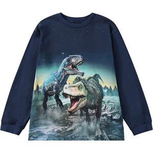 Dark blue top in organic cotton with long sleeves, round neckline, ribbed trim at the neckline and sleeves. It has a loose fit and a placement print on the front. Did you know that many more dinosaurs than previously thought had feathers? This print shows two dinosaurs playing, just like the stars have emerged in the night sky.