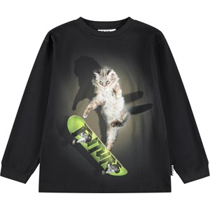 Black, long-sleeved top made of organic cotton with ribbed neckline and sleeves. The long-sleeved top has a loose fit with a front print of a cat on a skateboard.