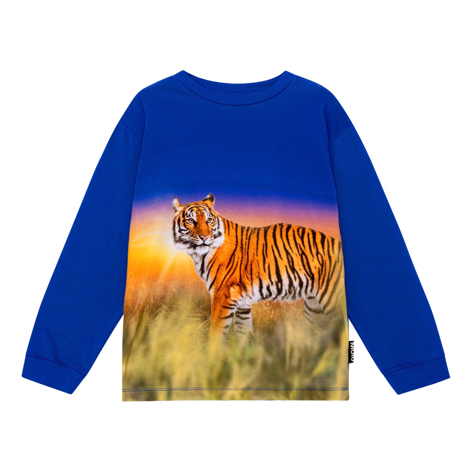 Rube is a blue top with long sleeves in 100% organic cotton. It has a print on the front of a tiger at dusk on the hunt for an evening snack. Maybe the tiger should just eat a carrot? Rube has a round neck with a rib edge as well as a rib edge at the sleeves. It is in a loose fit.
