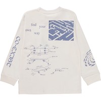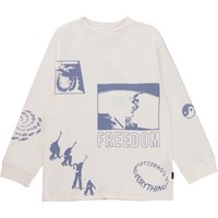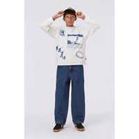 White, long sleeve t-shirt with a blue placement print. This print is inspired by the skater world. The print has graphic elements like photos, graphic specs, symbols and short texts that, all together, create a graphic collage in two tones. This long sleeve t-shirt is in 100% cotton, has a round neck with a rib edge, long sleeves and rib at the sleeves. It is in a loose fit. Wear it under a short sleeve t-shirt for a cool, layer-on-layer look.