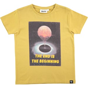 Short sleeve curry yellow t-shirt with a digital space print on the front.