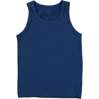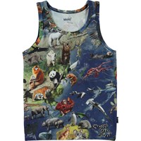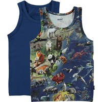 Pack of two vests in organic cotton. One vest is in dark blue, and the other is in a print of Earth's continents with the animals that live there.