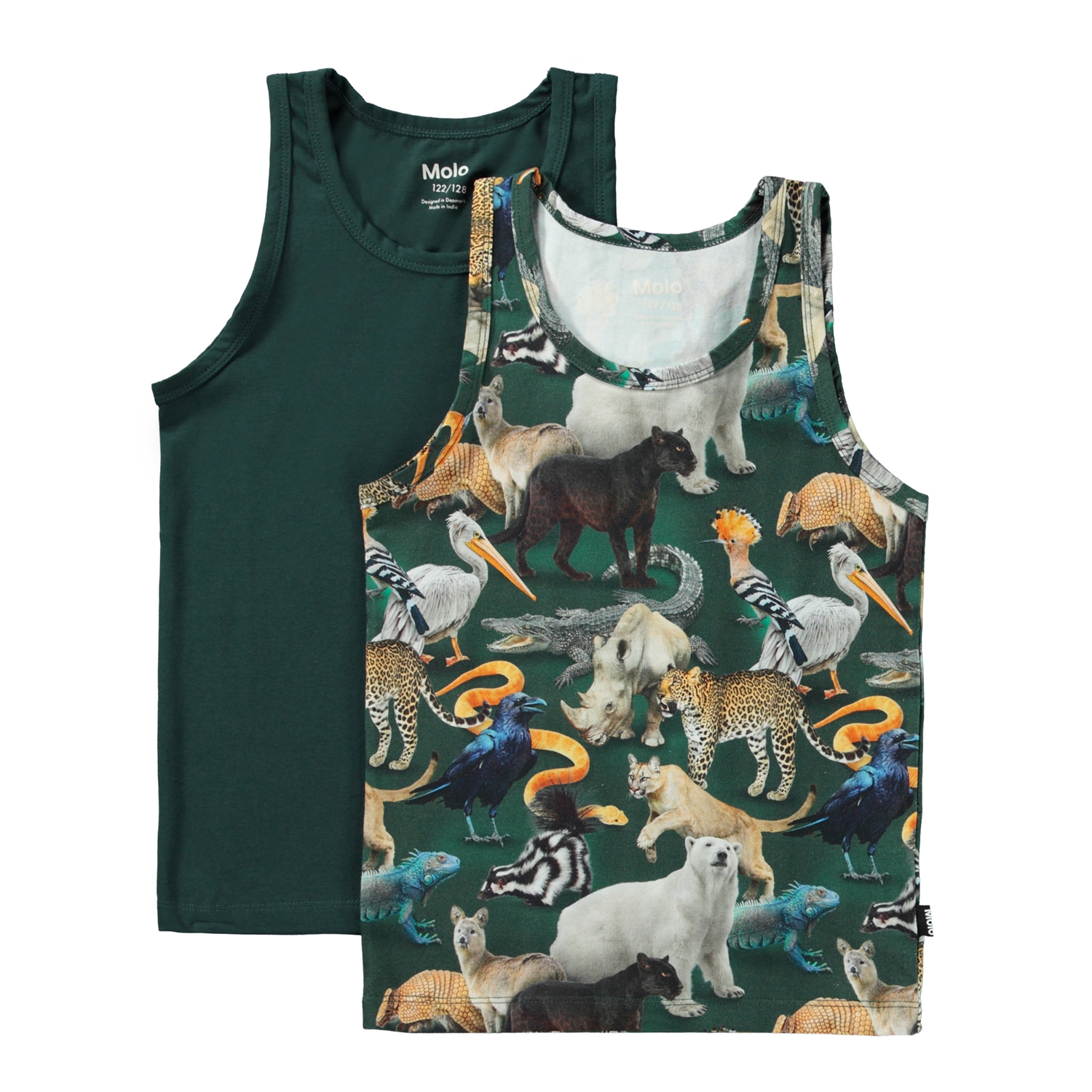 2-pack vests in organic cotton. The pack includes a dark green vest and one with an all-over print of animals.