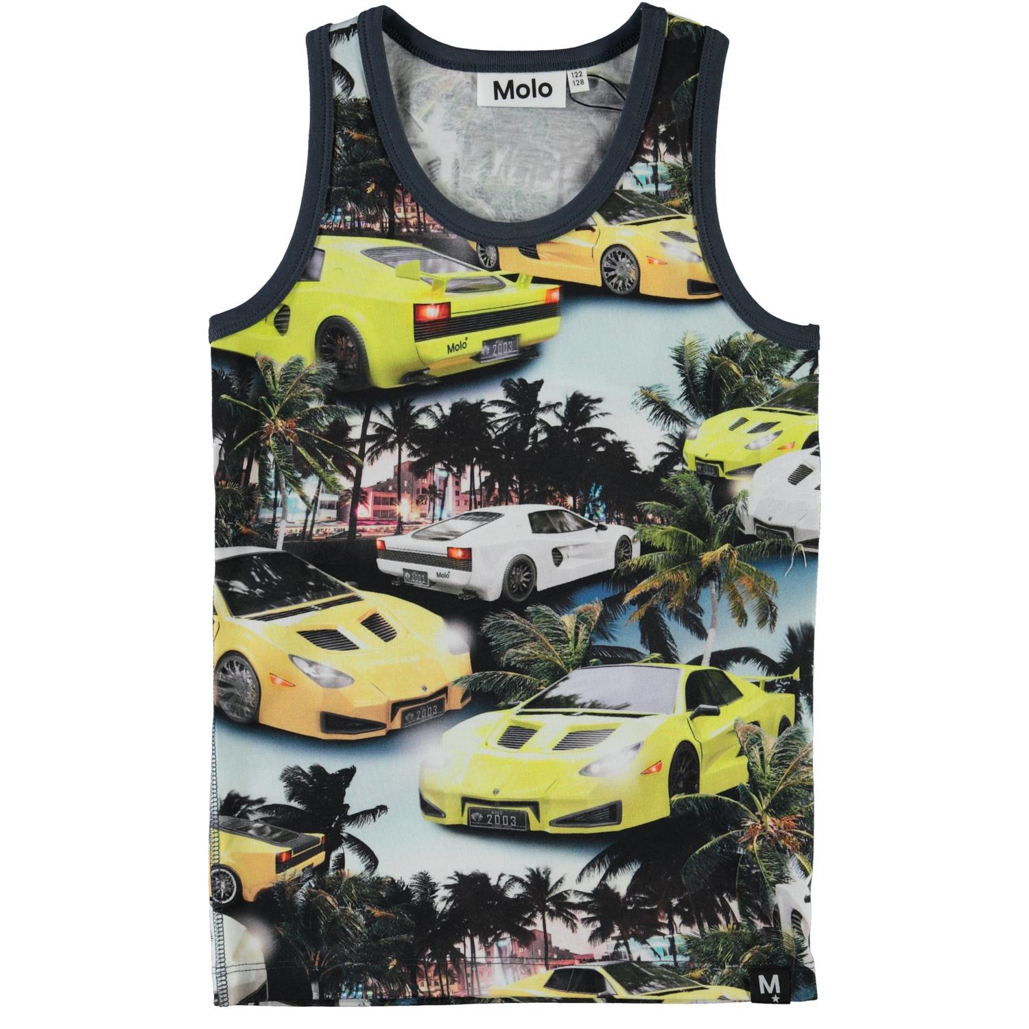 Jim is a vest with a print of fast cars and palm trees on a light blue background.