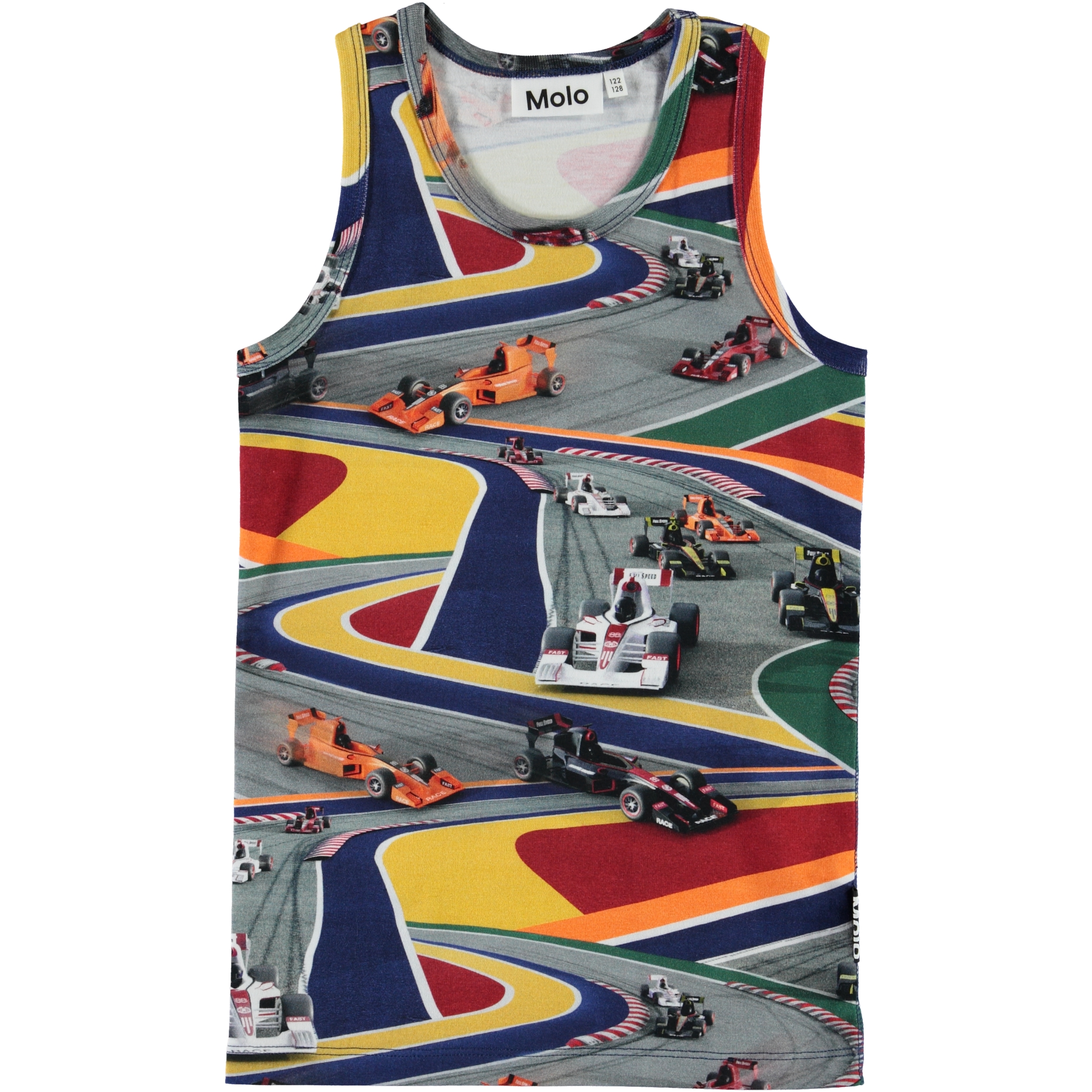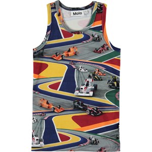 Jim is a vest with the 'Full Speed' print that shows fast cars on different coloured racetracks.
