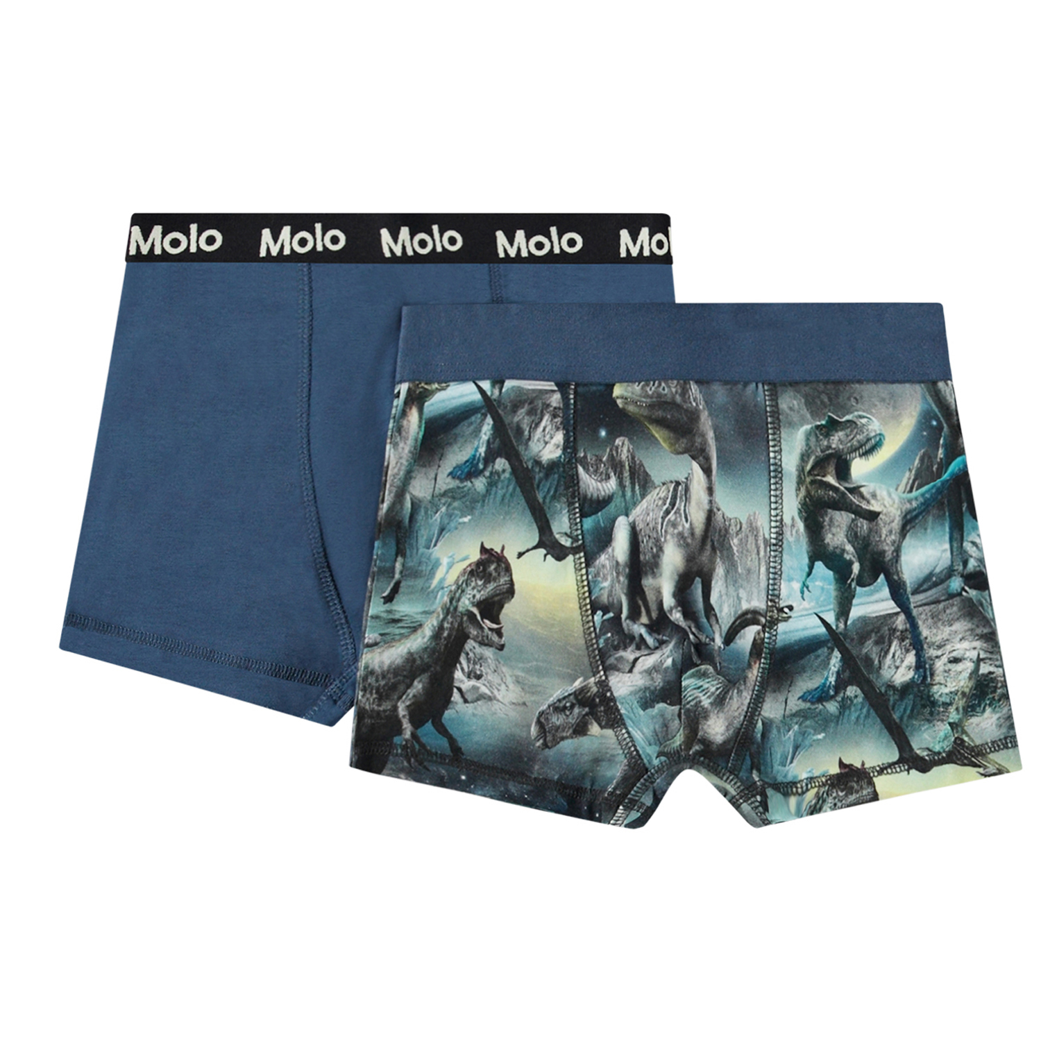 2-pack of boxershorts in organic cotton. The pack includes a pair of dark blue boxershorts and a pair with an all-over print of dinosaurs.