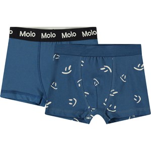 2-pack of boxer shorts in soft organic cotton. The pack includes a pair of dark blue boxer shorts and a pair with a print of smiling faces.