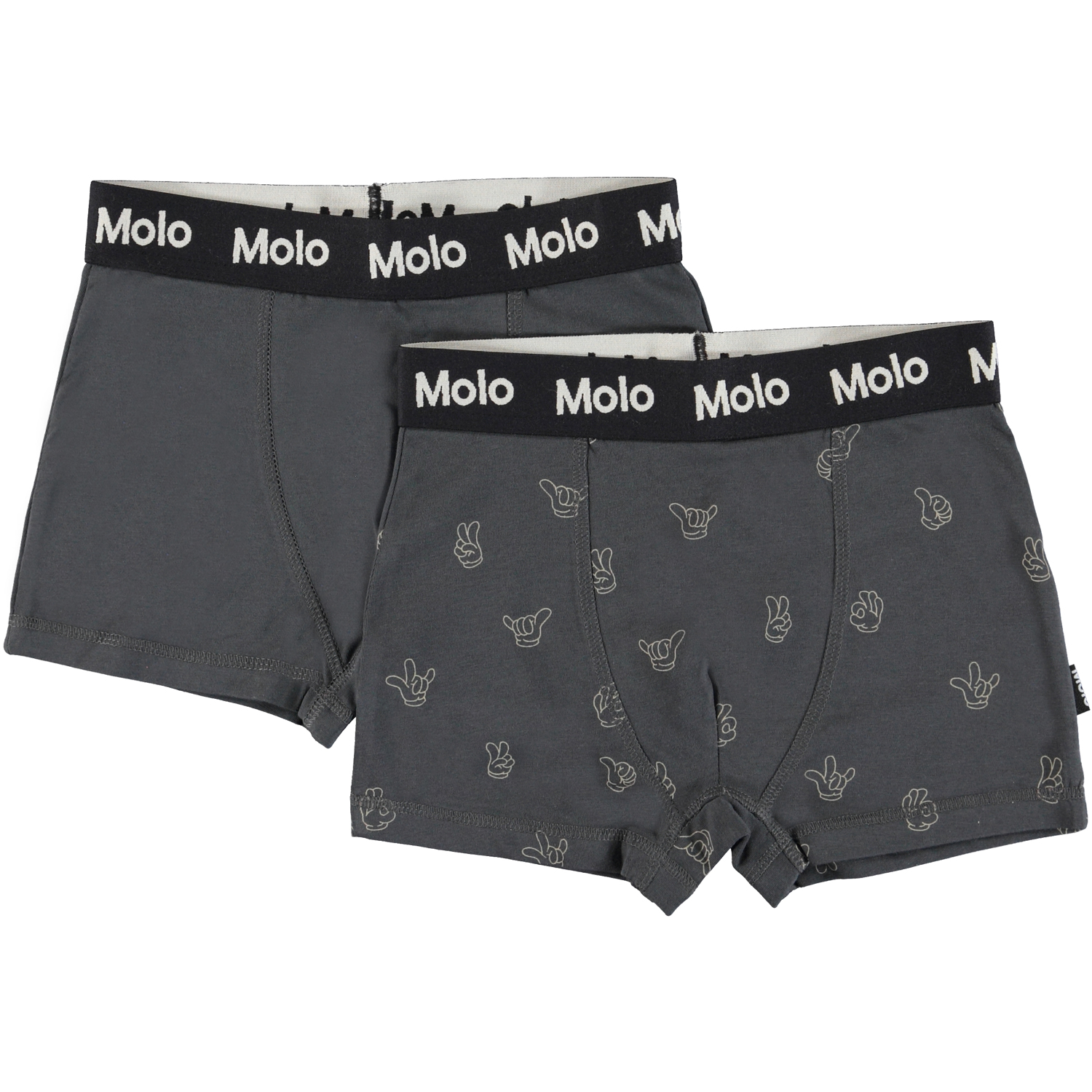 Pack with two pairs of boxershorts. One pair is in grey and the other is in a print of various hand signs. The boxer shorts have a wide elastic waist for a comfortable fit.
