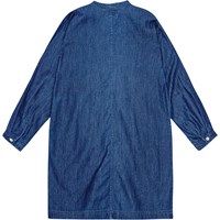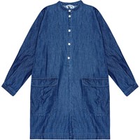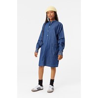 Blue denim loose dress in organic cotton. The dress is knee-length, has a small mandarin collar, buttons on the front, and buttons and cuffs on the sleeves. The cargo pockets on the front give the dress a relaxed and cool look.