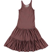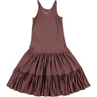 Cai is a rose and black striped strap dress. The dress has a long, draped skirt.