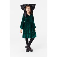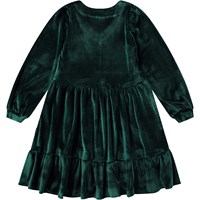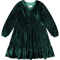 Knee-length bottle green velvet dress with long sleeves, v-neckline, and a wide waistband for a snug fit. The dress is easy to put on with an invisible zipper on the side. The generously gathered skirt with an additional ruffle drapes beautifully in the soft velvet.