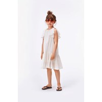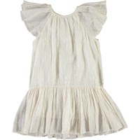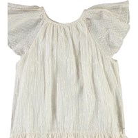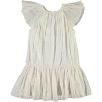 Calee is a white dress with metallic stripes. The dress has a lovely drape and has full sleeves.