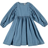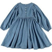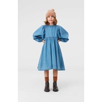 Caly is a blue denim dress with large sleeves and a full skirt. It has a button closure in the back.