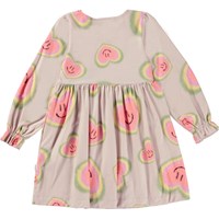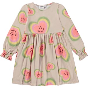 Beige, knee length dress in an all over aura heart print. Imagine that everything has an aura- people, plants and animals. The print is of aura hearts that are glowing with colours, smiles and love. Aura colours are like the colours of the rainbow and reflect the feelings of our inner spirit. We are willing to open our hearts to all the things we cannot see and believe that there is more to life than what our eyes can see. This dress is in 100% cotton jersey, has a round neck, long sleeves with ruffle details, a high waist and a skirt with a lot of movement. It is in a loose fit.