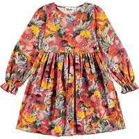 Camie is a red dress wtih a print of various animals and colourful leaves. The dress has an elastic waist and elastic at the sleeves.
