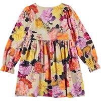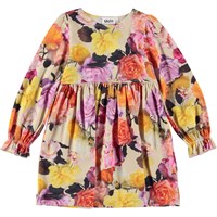 Camie is a mulit-coloured jersey dress in organic cotton. The dress is high waisted and has long sleeves with elastic and a small ruffle at the wrists. The dress is in the all over Rose Garden print, which depicts all the garden roses in all sorts of colours.