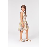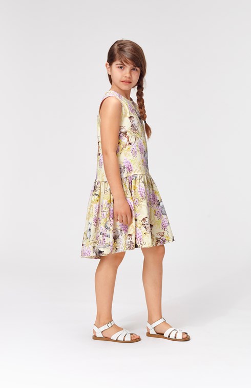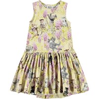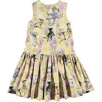 Candece is a dress with a print of small cats that are playing among purple flowers. The dress has a vest inspired top, and the skirt is full and longer in the back.
