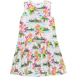White dress in soft, organic cotton jersey. The dress has a round neck and a full skirt. The print is a multi-coloured, all over print of desert islands, palm tree beaches and Hawaiian flowers in fresh colours.