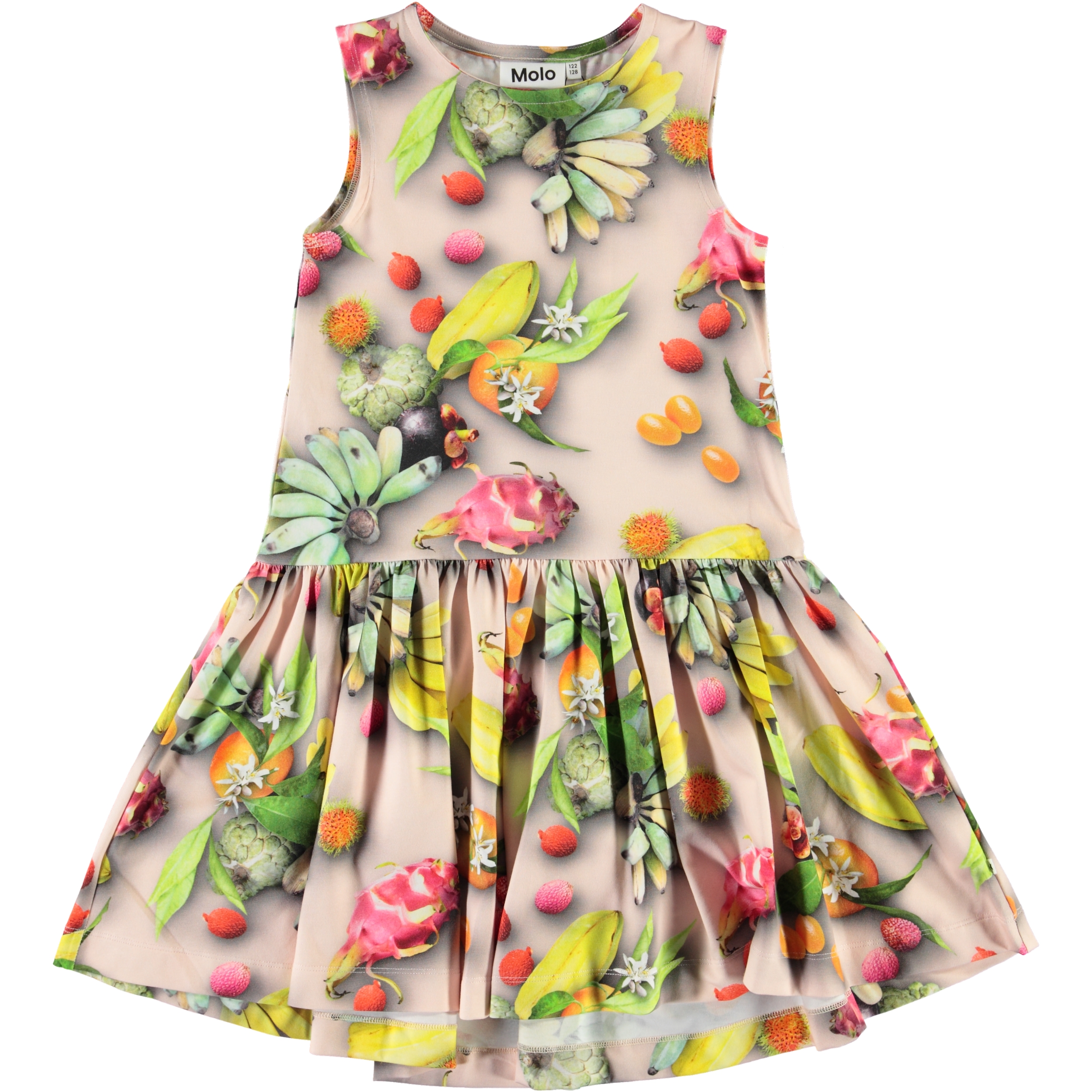 Candece is a dress in the 'Tutti Frutti' print, which is filled with tropical fruit. It has a vest-inspired top and a full skirt that is longer in the back.