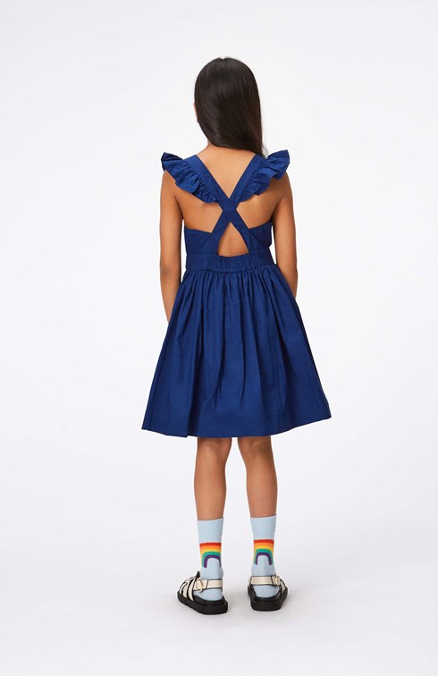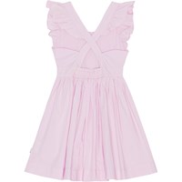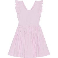Pink, knee length dress in organic cotton. It has a deep, round neck as well as a ruffle edge around the armhole that creates a small sleeve. The dress has an open back with crossed straps and has elastic at the back of the waist, making it easy to slip on and off. The skirt of the dress is gathered and full.