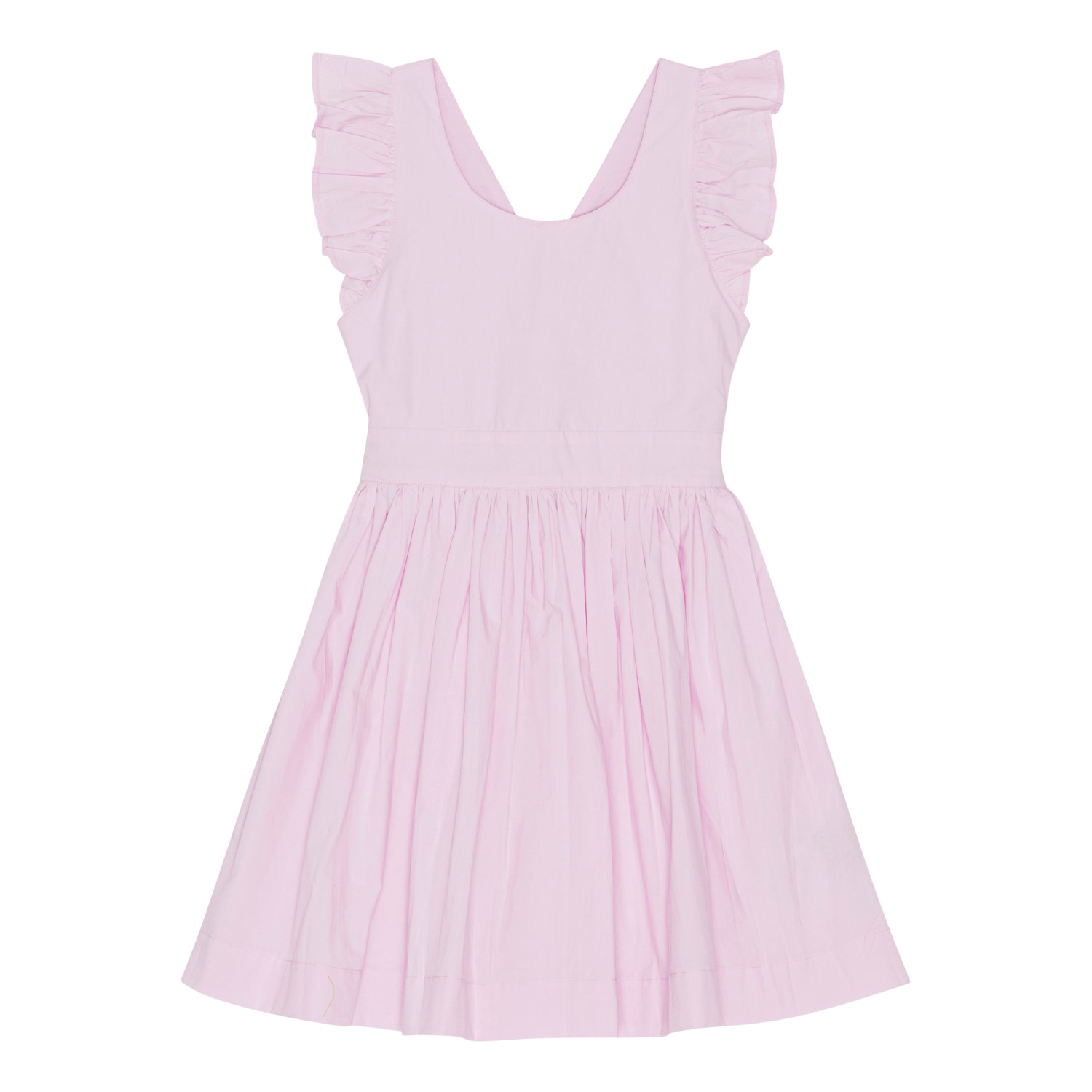 Pink, knee length dress in organic cotton. It has a deep, round neck as well as a ruffle edge around the armhole that creates a small sleeve. The dress has an open back with crossed straps and has elastic at the back of the waist, making it easy to slip on and off. The skirt of the dress is gathered and full.