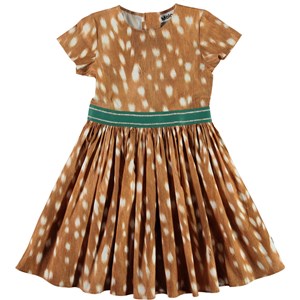 Candy is a brown dress with white spots that look like the buckskin of a deer. It is constructed in a stretch poplin, which makes it extra comfortable. Candy has a zip closure at the neck and a striped elastic waist.