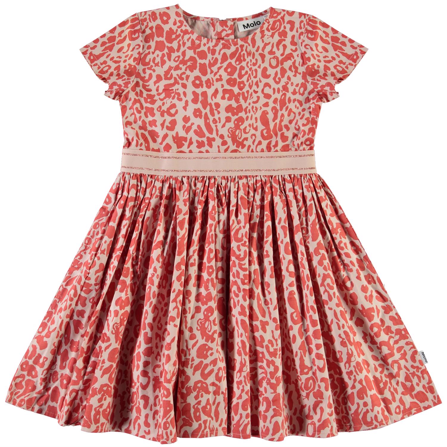 Candy is a poplin dress with stretch that makes it really comfortable to wear. Candy has short sleeves and a red leopard print on a pink background. The dress has a zip closure at the neck and a pink wasitband.