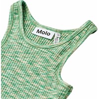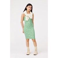 Knee-length tank top dress in stretchy organic cotton rib with wide straps and a round neck. The dress is woven in green, white, and light brown colours, creating a lovely texture.