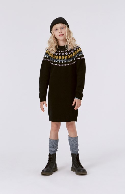 Black knit dress with a nordic-inspired pattern on the yoke. The pattern is inspired by nordic knit traditions but with a Molo twist. This knit dress is in a soft wool blend that makes it perfect for colder days. It has a round neck with a rib knit, long sleeves with rib and is in a regular fit. If you have cold ears then match this dress with the Kamma hat in the same pattern for a cute look.