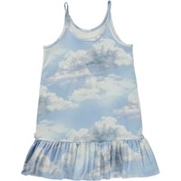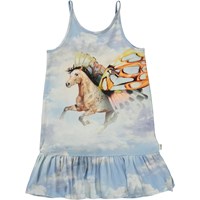 Carrie is a light blue strap dress in organic cotton jersey. The dress is knee length with a sewn on ruffle, giving it an airy look. Carrie is in the Butterfly Horse all over print, which pictures a horse, with beautiful butterfly wings, flying around soft clouds.