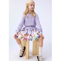 Long-sleeved light purple dress made of organic cotton with a fitted ribbed jersey top and poplin skirt. The dress has a regular fit with a print of animals dressed in clothes on the skirt.