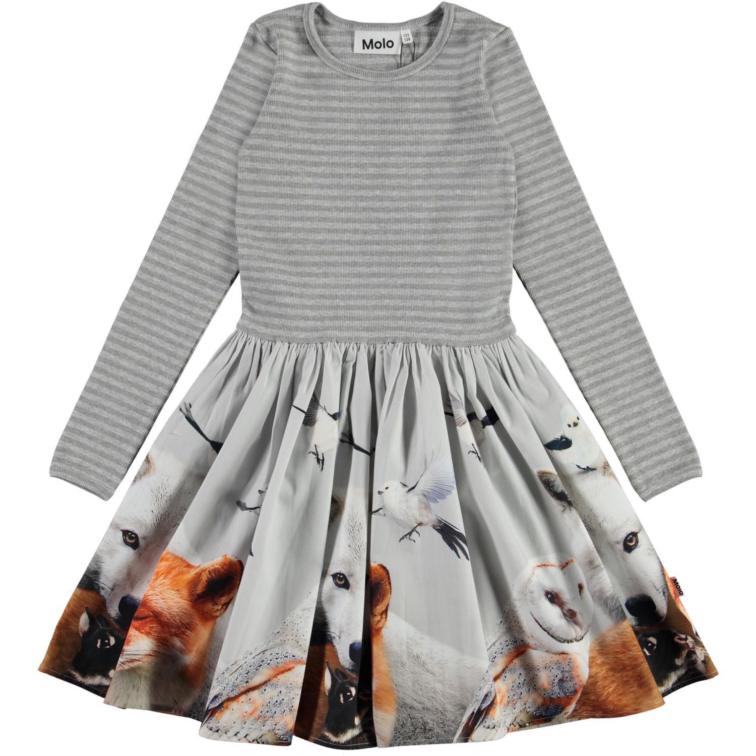 Casie is a long sleeve dress in two parts. The top is in grey striped rib, while the skirt is in a print of various animals of the forest.
