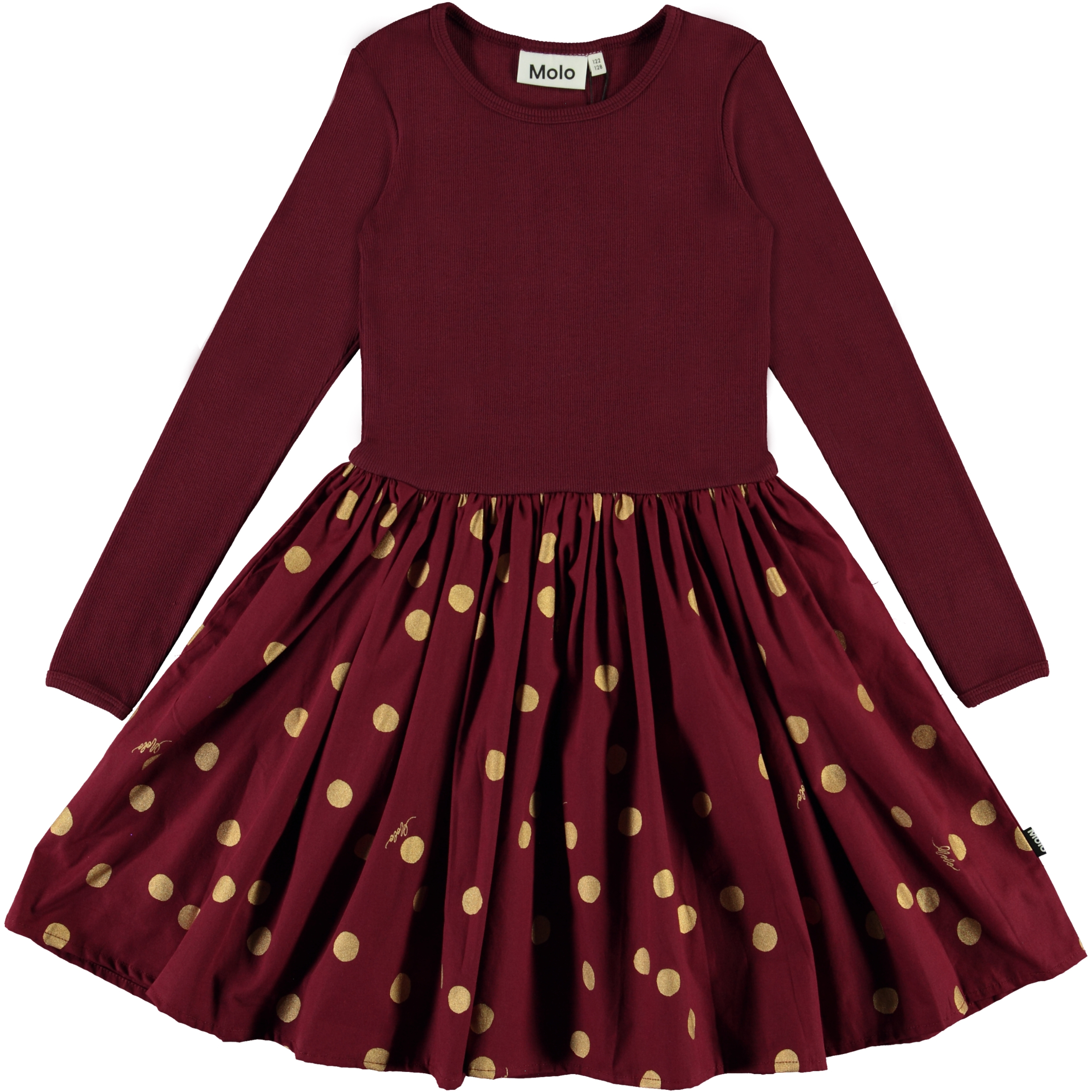 Casie is a dark red dress in two parts. The top is a rib quality with long sleevs, while the skirt has a yellow polka dot print.