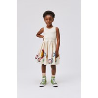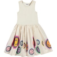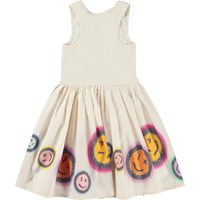 Cassandra is a sleeveless dress in off-white with a circular skirt in organic cotton. The top of Cassandra is in rib jersey, and the bottom is in cotton poplin with smiley faces in a variety of colours.