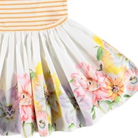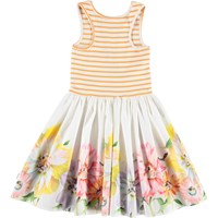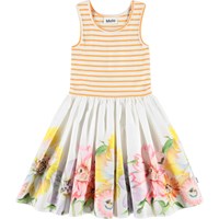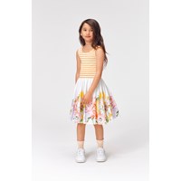 Cassandra is a dress in two parts, where the top is sleeveless in white rib with rose coloured edges. The skirt is in a rose colour with a print of birds that are skating.