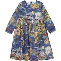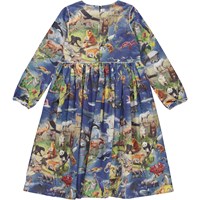 Cassiopeia is a blue midi dress, with long sleeves, in organic cotton. The dress is long and has a full skirt with the all over Amazing Earth print, which shows Earth's continents and all the animals that live on the land and in the water. The dress has elastic at the sleeves and lovely white piping detail at the neck, sleeves, waist and armholes. The dress has a concealed back zip closure.