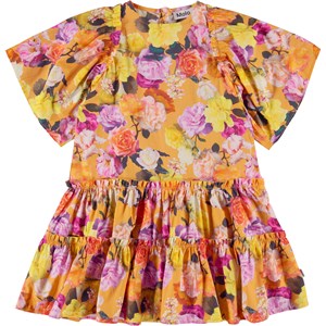 Cat is an orange dress in a loose fit, with a print of wild roses. The dress is in organic cotton and has raised shoulder seams with short sleeves and a back zip closure. The full skirt begins at the hips and consists of large, sewn on ruffles that stop at the knees.